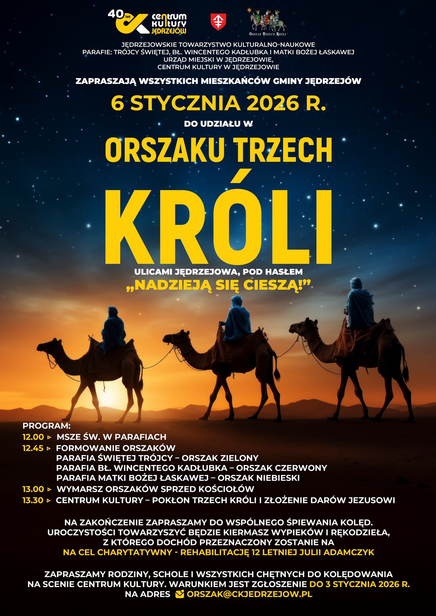 6 stycznia 2026 r. Jędrzejów znów wypełni się kolorem, śpiewem i prawdziwie świąteczną atmosferą. Zapraszamy Was serdecznie do wspólnego przeżycia Orszaku Trzech Króli, który przejdzie ulicami naszego miasta pod hasłem „Nadzieją się cieszą!”