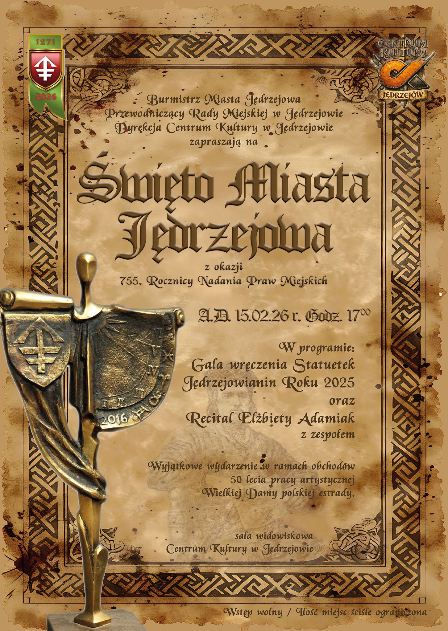 Burmistrz Jędrzejowa Marcin Piszczek, Przewodniczący Rady Miejskiej w Jędrzejowie Wacław Kędra oraz Dyrekcja Centrum Kultury w Jędrzejowie serdecznie zapraszają wszystkich do udziału w uroczystych obchodach 755. rocznicy nadania praw miejskich miastu Jędrzejów, które odbędą się 15 lutego (w niedzielę) o godz. 17:00 w Centrum Kultury w Jędrzejowie.
